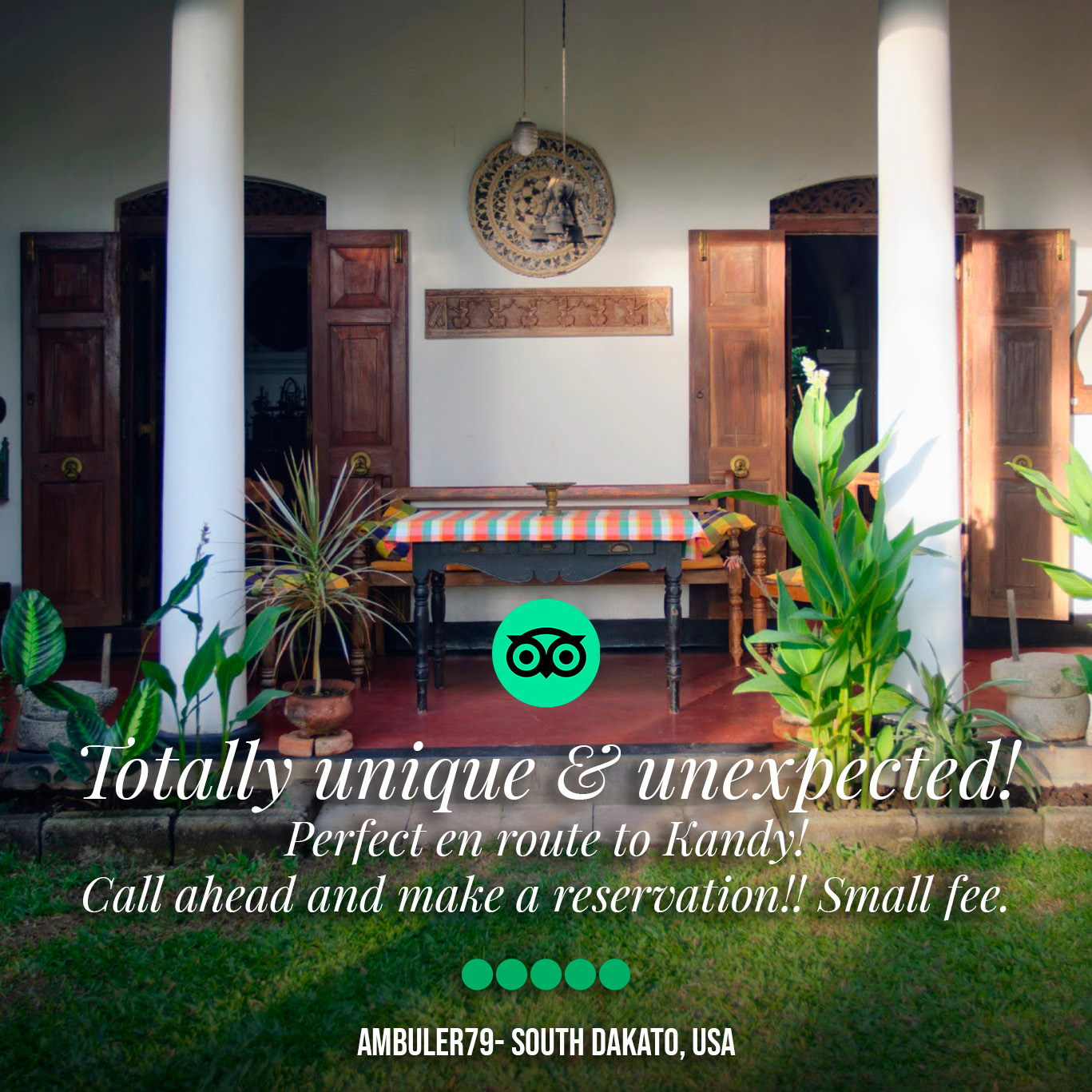 À quelques minutes du centre de Kandy, sur la fameuse "route des temples", ce lieu est idéal pour échapper à l'agitation de la ville [...] Le repas [servi] dans la cour intérieure, dans un cadre apaisant et ressourçant, est inoubliable.